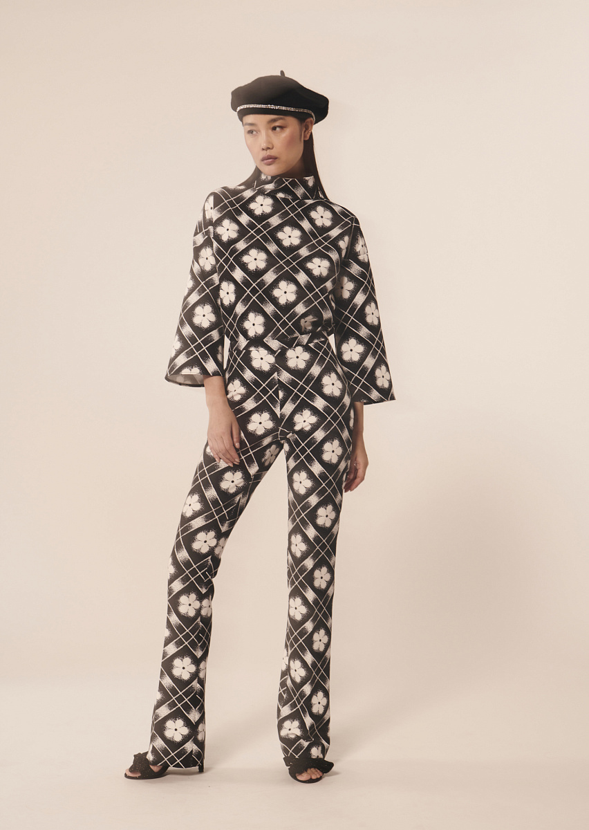Черные брюки прямого кроя с крупным цветочным принтом и узором в клетку. Два прорезных кармана сзади. Ретро-настроение в Tara Jarmon!