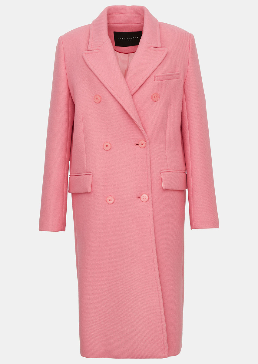 Длинное розовое пальто-бушлат прямого кроя в маскулинном стиле. Воротник с лацканами, боковые карманы с клапанами и длинные рукава с манжетами на пуговицах придают ему классический, неподвластный времени вид. Выполненное из шерсти, оно будет согревать Вас в течение всего сезона. Двубортная застежка на пуговицы в тон.