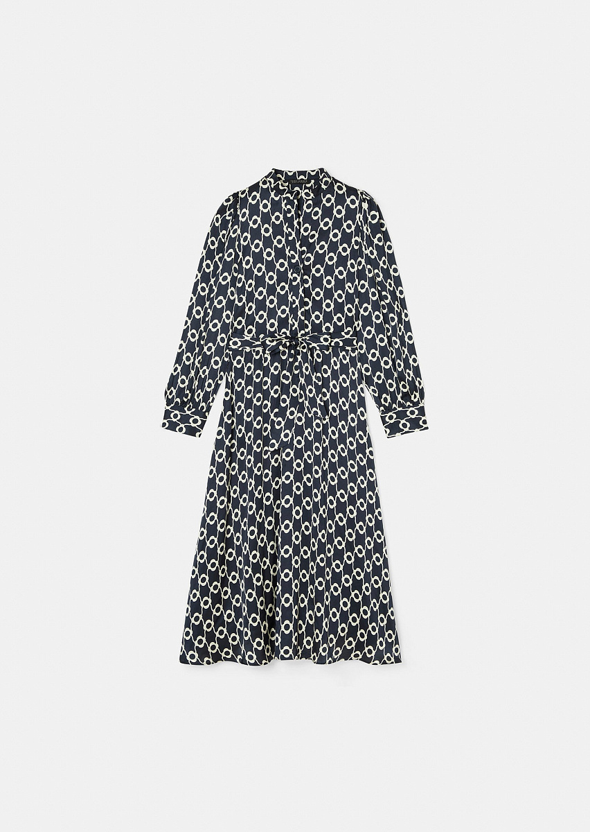 Это длинное платье темно-синего цвета с цветочным принтом в оттенке экрю выполнено из крепа, имеет V-образный вырез и длинные рукава с манжетами на пуговицах. Модель регулируется по талии благодаря съемному поясу в тон. Спереди платье застегивается на скрытые черные пуговицы, а также на красивую перламутровую пуговицу. Такие же пуговицы можно найти на манжетах.