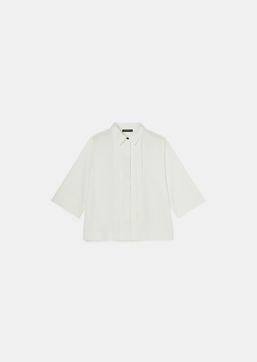 Белая блуза из поплина с короткими рукавами и классическим отложным воротником на черной пуговице. Слегка расклешенный крой. Деликатные складки и застежка спереди на небольшие потайные пуговицы.