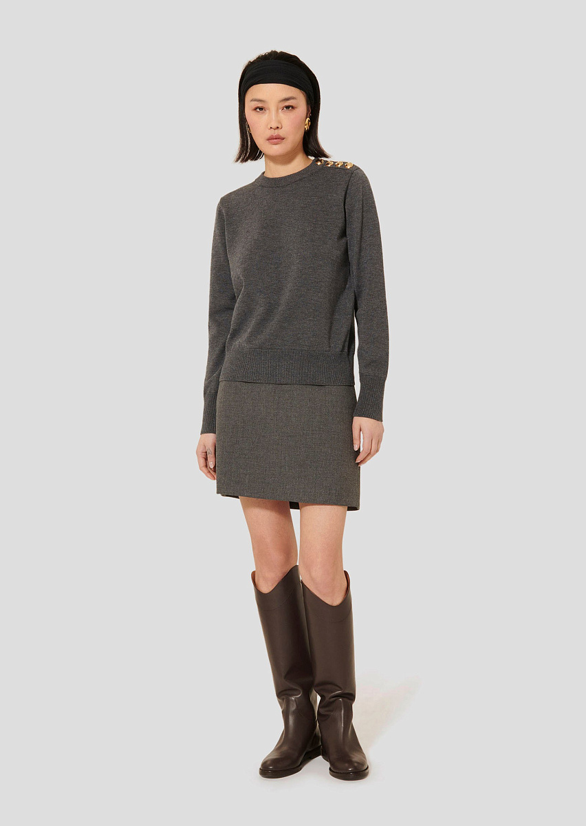 Этот серый свитер с эффектом меланж имеет длинные рукава и круглый вырез. Изюминка в стиле Tara Jarmon заключается в золотистых пуговицах с монограммой дома, украшающих левое плечо. Он изготовлен из мягкой шерсти, которая на ощупь точь-в-точь как кашемир. Идеально подходящий для межсезонья, этот кардиган в классическом цвете готов сопровождать Вас каждый день.