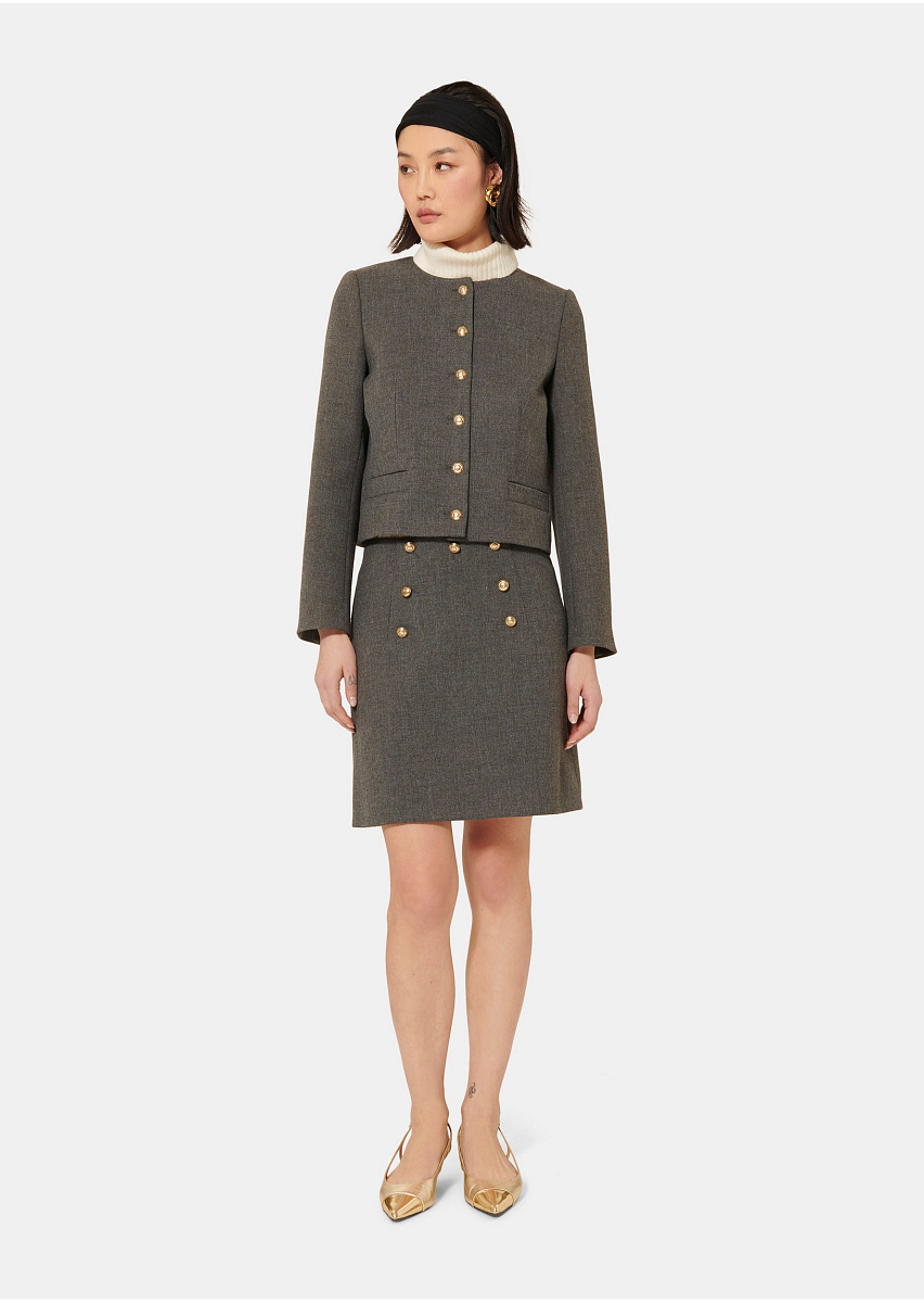 Эта короткая юбка серого цвета из плотной ткани имеет два прорезных кармана сзади и украшена золотистыми пуговицами спереди. Модель застегивается на невидимую молнию сзади.