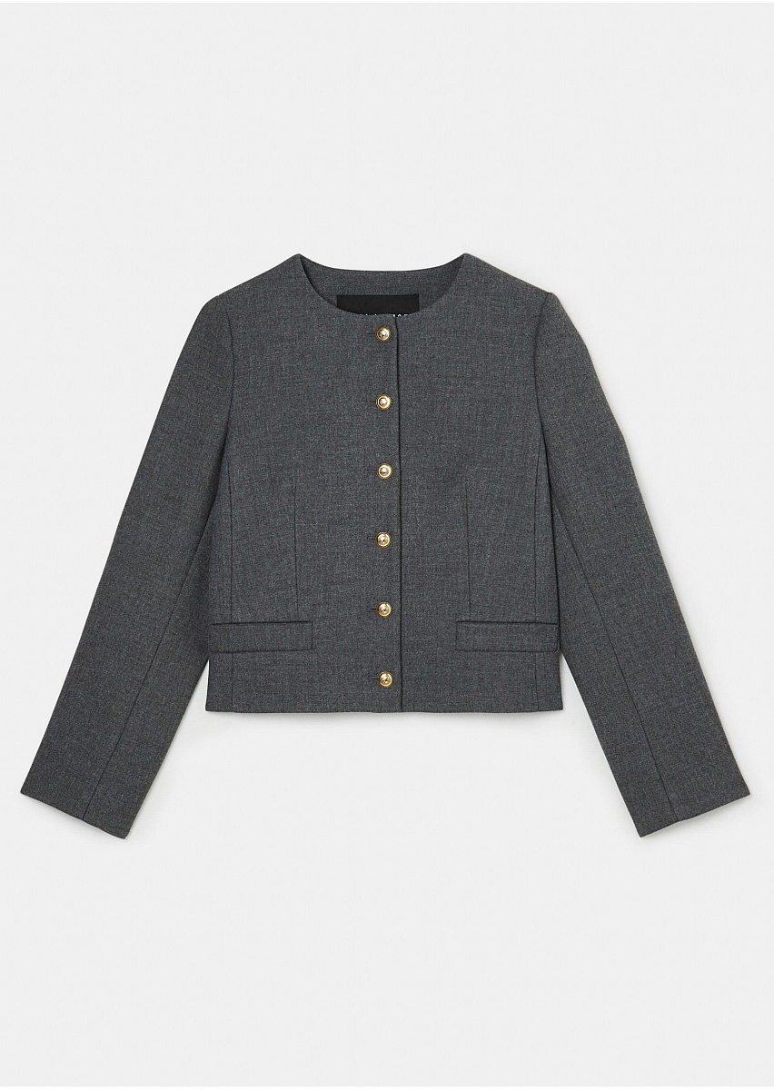 Эта серый жакет из плотной ткани имеет длинные рукава, круглый вырез и два прорезных кармана по бокам. Укороченный, слегка зауженный крой застегивается спереди красивыми золотистыми пуговицами. Носите модель в комплекте с юбкой Jamie, чтобы создать женственный и элегантный образ.
